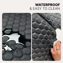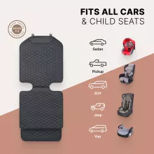 The eco-leather top and the 600D Oxford lining are waterproof and do not let liquids onto the seat, protecting the upholstery against leaks and stains. This waterproof feature also makes our seat protector very easy to clean with a damp cloth or wet wipes.