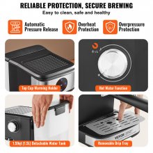 • Easy Maintenance: The 1.59qt (1.5L) detachable water tank reduces the need for frequent refills, while the removable drip tray ensures easy cleaning. Additional features like the cup warming holder and automatic pressure release enhance convenience and safety.