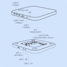 • Multiple Interfaces: Equipped with M.2 NVMe/NGFF and 2.5-inch SATA hard drive enclosures, 4K@60Hz DP1.4, 10Gbps USB 3.1 Gen2, 10Gbps USB-C, and 2 5Gbps USB 3.0 ports, as well as an SD/Micro SD card slot, this hub offers unparalleled versatility to meet all your connectivity needs.