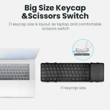 Experience laptop-like typing wherever you go. Our foldable keyboard boasts a large, ultra-responsive touchpad with left and right click capabilities, making navigation a breeze. With its tri-fold design, it combines the comfort of a standard-sized keyboard with the portability of a mini keyboard, making it perfect for busy professionals on the move.