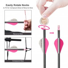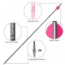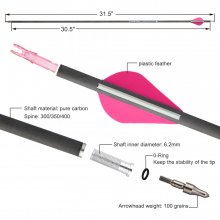 Our Pure Carbon Arrows come in three spine options: 300, 350, and 400, each tailored to meet the needs of different archery styles and bow types. The total arrow length is 805mm with a shaft length of 762mm, providing the ideal balance and stability for your shots. The arrows feature a sleek design with 2 pink and 1 white feather, and a transparent pink tail, combining aesthetics with functionality.