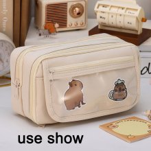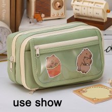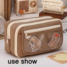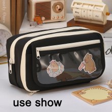 The pencil case/pouch is super spacious. The transparent part of the item also has a magnet that detaches it at the bottom which is helpful for putting pins/badges in.