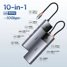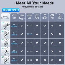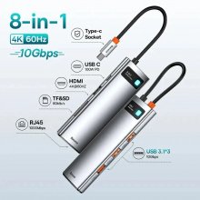 Our USB-C hub stands out with its 8-in-1 functionality, offering a comprehensive range of ports including HDMI 4K@60Hz output for stunning visuals, three USB-A 3.1 ports at 10Gbps for rapid data transfer, a USB-C PD 100W for quick charging, and convenient SD and TF card slots at 104MB/s. Not to forget the RJ45 Ethernet port, ensuring a stable, high-speed network connection.